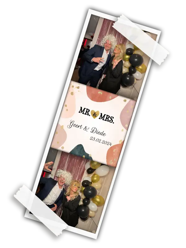Gasten op het feest / evenement kunnen zelf eenvoudig foto’s maken met de Photobooth. Je kunt het pakket uitbreiden met extra functionaliteit en/of attributen